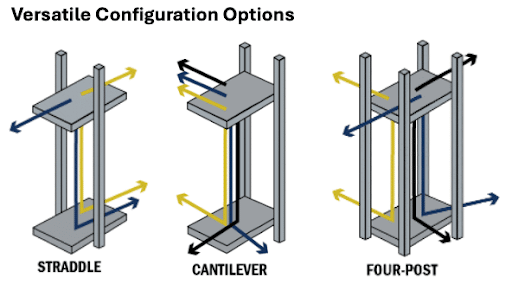 In a straddle configuration, the VRC’s carriage is placed between the two guide columns, distributing the weight of the load vertically along the length of both columns. This type of configuration allows for greater lifting capacity and larger carriage platform sizes than a cantilever configuration.